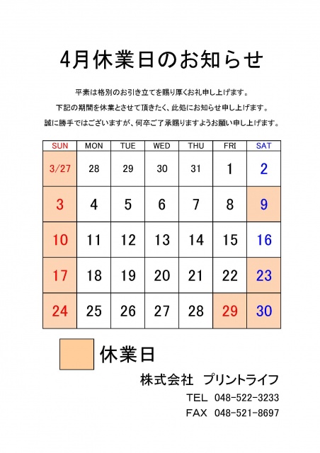 2022年 4月01日 金曜日 4月休業日のお知らせ お客様各位 平素より大変お世話になっております。 4月休業日のお知らせとなります。 宜しくお願い致します。 ㈱プリントライフ社員一同 投稿者:printlife 投稿ナビゲーション « 卒業式 5月休業日のお知らせ » 2022年4月に投稿したプリントライフの記事一覧